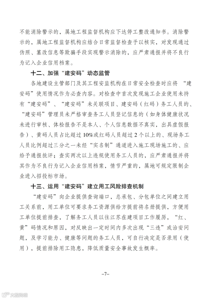对检查中首次发现施工企业使用未持有“建安码”、“建安码”未关联项目、建安码(红码)务工人员的、黄码人员占比超过10%或红码人员超过2个以上的、现场务工人员比例超过三分之一未经“实名制”通道进入施工现场施工等情形的,应给予通报批评;