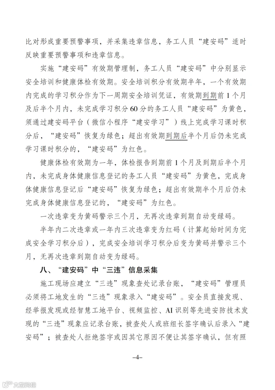 (二)加强日常安全监督管理。试点三地建设主管部门要根据《方案》要求,将“建安码”使用情况纳入日常安全监督抽查内容,定期对试点项目系统应用情况进行排名,对覆盖率和使用率较低的项目和单位进行通报。