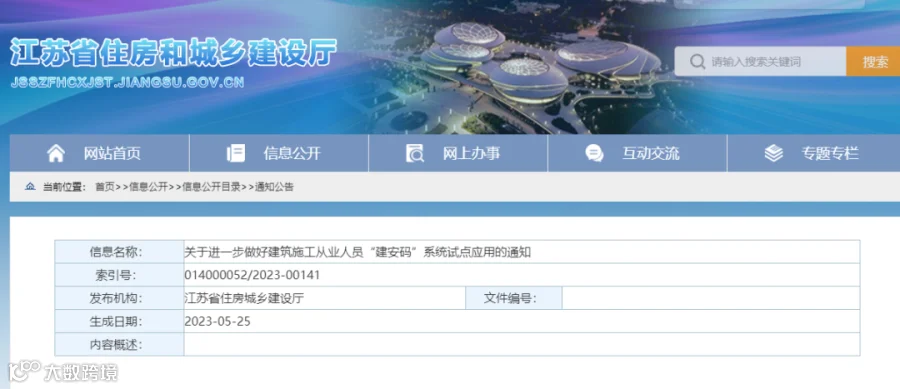 今年5月,江苏省住建厅发布《关于进一步做好建筑施工从业人员“建安码”系统试点应用的通知》,先行在盐城市本级、扬州市邗江区、镇江市句容市三个区域内所有在建项目中试点。