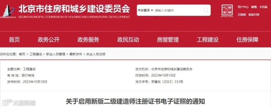 10月18日,北京市住建委发布《关于启用新版二级建造师注册证书电子证照的通知》。