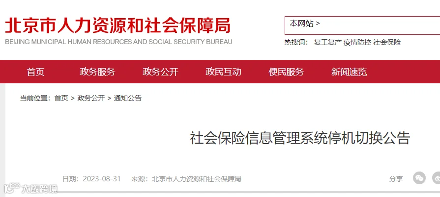 根据人力资源社会保障部关于建设全国统一的养老保险全国统筹系统的工作部署,北京市社会保险管理信息系统定于2023年9月25日(星期一)18时停机,切换至全国养老保险统筹信息系统,期间全市部分社保业务暂停服务。