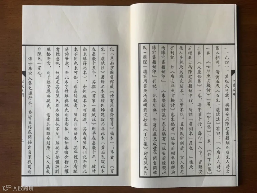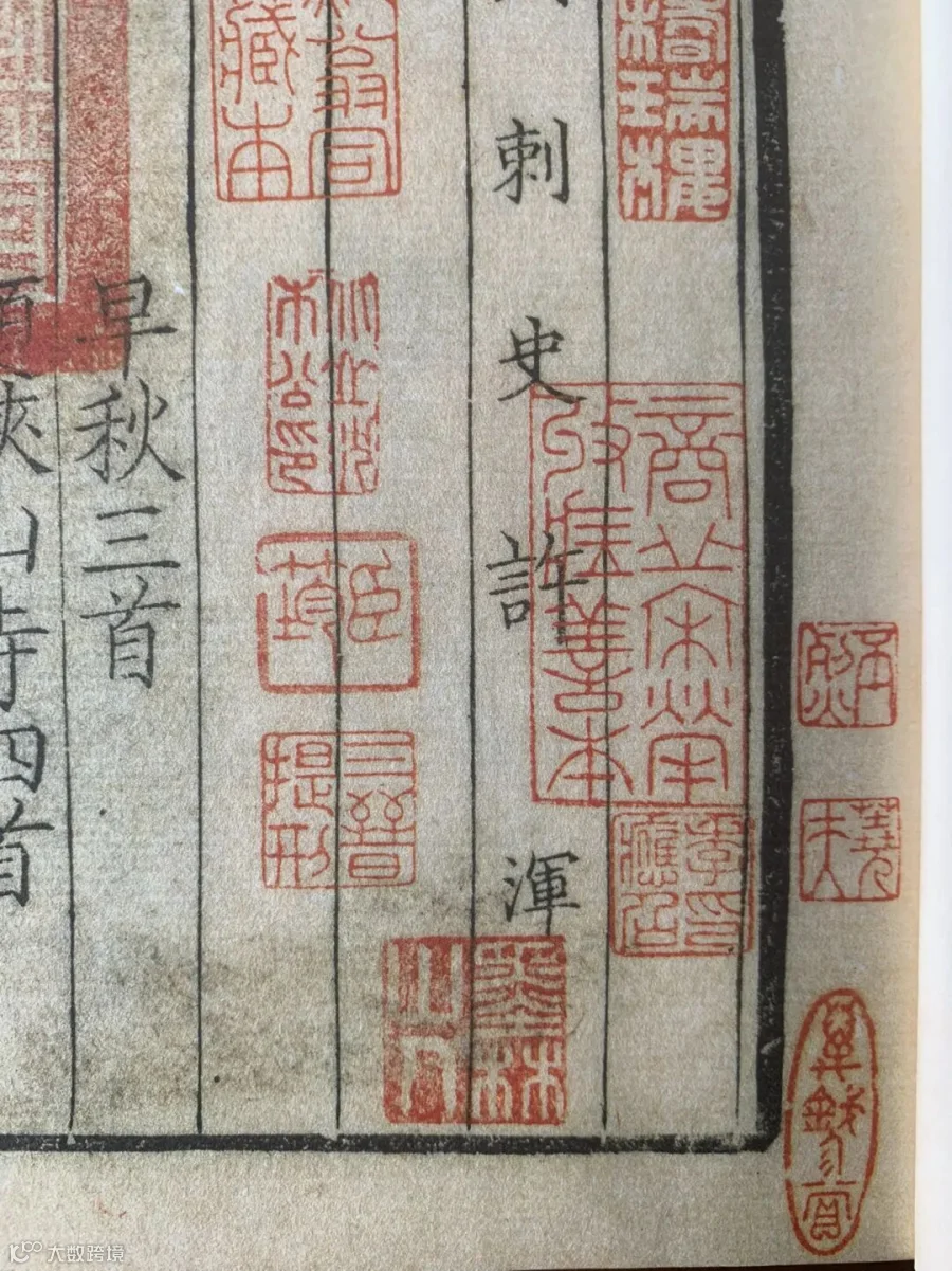 此本避讳“敦”字,当刻于南宋光宗间(一一九○~一一九四)。其版式行款,与临安府陈宅书籍铺刻唐宋人诗文集本相同。清黄丕烈《百宋一廛赋注》有曰:“《唐山人诗》一卷、《女郎鱼玄机诗》一卷、《甲乙集》十卷、《许丁卯集》二卷、《朱庆余集》一卷,每半叶十行,每行十八字,皆临安府棚北大街陈宅经籍铺印行,所谓‘书棚本’是也。”据此,后人多视此为陈氏刻本。其实不然。盖陈氏所刻唐、宋人集每有刊记,如《唐女郎鱼玄机诗》卷末镌有“临安府棚北睦亲坊南陈宅书籍铺印”、《朱庆余诗集》卷末镌有《临安府睦亲坊陈宅书籍铺印》刊记,此本则无。而清代道光咸丰年间云间韩氏(应陛)读有用书斋所藏明影宋抄本《丁卯集》却有陈氏刊记(见南京图书馆藏《读有用书斋书目》稿本);再者,《百宋一廛赋注》著录之本业经何焯题跋而非此本(黄丕烈跋此本在嘉庆十五年,其撰《百宋一廛赋注》则早在嘉庆十年,彼时尚未购得此本),今何跋本不可踪迹,其或有陈氏刊记而与此本不同也未可知;最为关键者,陈氏刊刻诸本,其字体颇有欧阳询笔意,而此本字体虽与陈氏刻本形似,但细审略含柳公权书体意味,故遽定其为陈氏刻本依据似不足。然就其整体版刻风格而言,刻于临安应无疑义,意者其时临安刻唐、宋人集或非陈氏一家也。