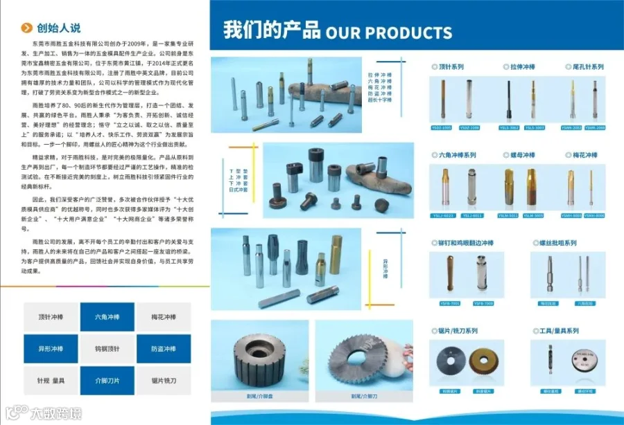 东莞市雨胜五金科技有限公司创办于2009年,是一家专业研发、生产、加工、销售为一体的紧固件五金模具配件生产加工企业。公司前身是东莞市宝鑫精密五金有限公司,位于东莞市黄江镇北岸村北岸南路29号,于2014年10月29日公司正式更名为东莞市雨胜五金科技有限公司,注册了雨胜中英文品牌,目前公司拥有雄厚的技术力量和团队,公司以科学的管理模式作为现代化管理,打破了劳资关系变为新型合作模式之一的新型企业管理模式。