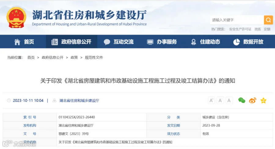 10月11日,湖北省住建厅印发了《湖北省房屋建筑和市政基础设施工程施工过程及竣工结算办法》,本办法自发布之日起施行。