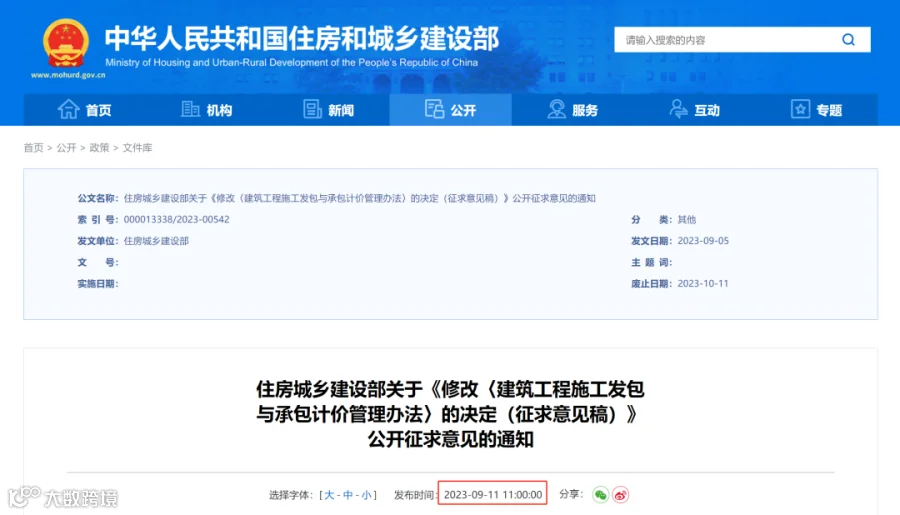 2023年9月,住建部对《建筑工程施工发包与承包计价管理办法》16号部令进行了修订。刚刚在官网发布关于《修改〈建筑工程施工发包与承包计价管理办法〉的决定(征求意见稿)》公开征求意见的通知。