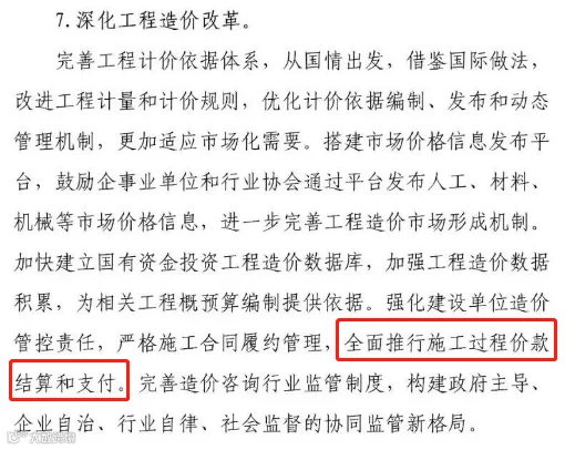 国常会明确要求在工程建设领域全面推行过程结算,住建部多次提出全面推行施工过程价款结算和支付。