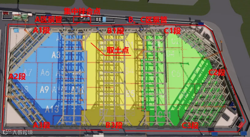 项目现场取土、现场拌合、现场浇筑,依据多次实验,经比对研究出利用现场开挖土和满足回填规范要求的固化土材料中固化剂、水泥、水的配合比。独创成套设备和工艺流程,设置适合项目取土路线和回填工艺的固化土拌合机械型号与位置。