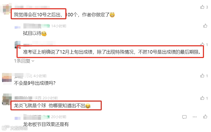 期望成绩早点出来,又担心成绩出后伤了心。这几天群里都炸锅了,都在讨论成绩的事,之前龙炎飞在直播中预测12月6号出成绩,结果打脸了,做了100个俯卧撑,节目效果拉满。