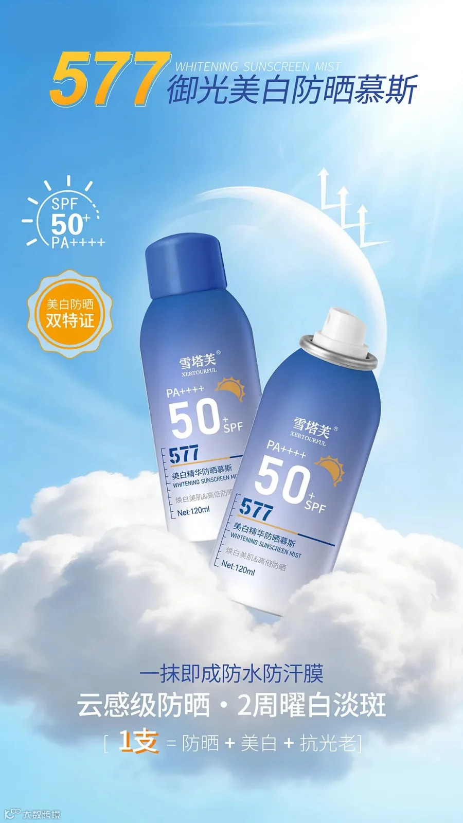 577御光美白防晒慕斯:一瓶搞定防晒美白抗老修护。