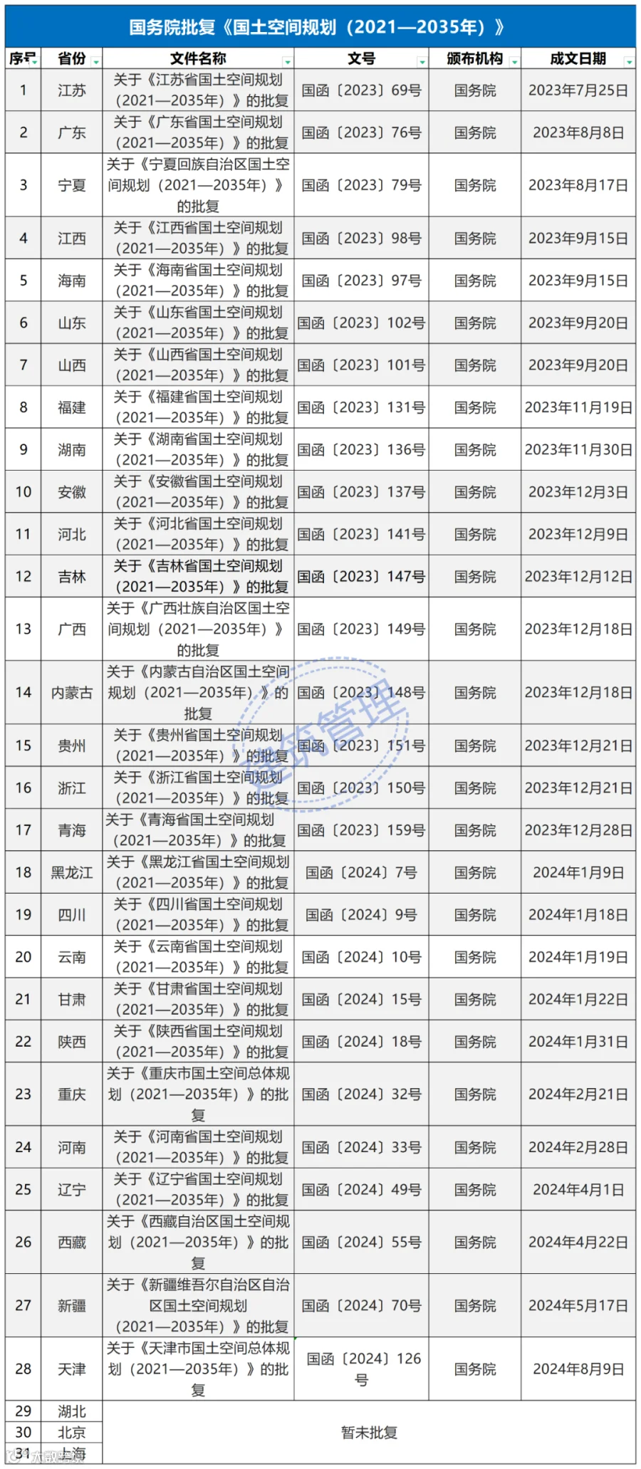 国务院已批复同意天津、江苏、广东、宁夏、海南、江西、山东、山西、福建、湖南、安徽、河北、吉林、内蒙古、广西、贵州、浙江、青海、黑龙江、云南、四川、甘肃、陕西、重庆、河南、辽宁、西藏、新疆等28个省(区、市)的省级国土空间规划。