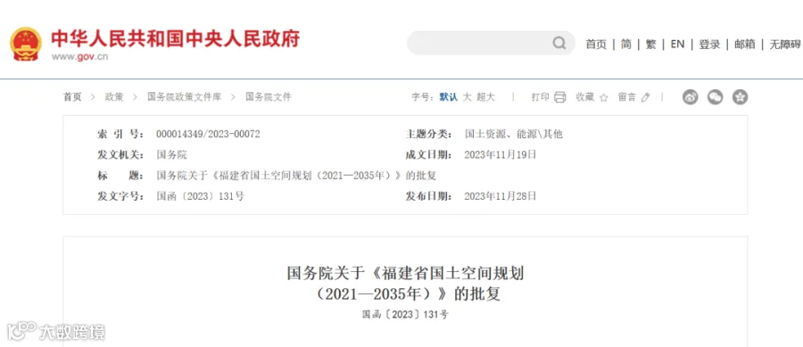 《福建省国土空间规划(2021—2035 年)》已于2023年11月19日经国务院批复同意。