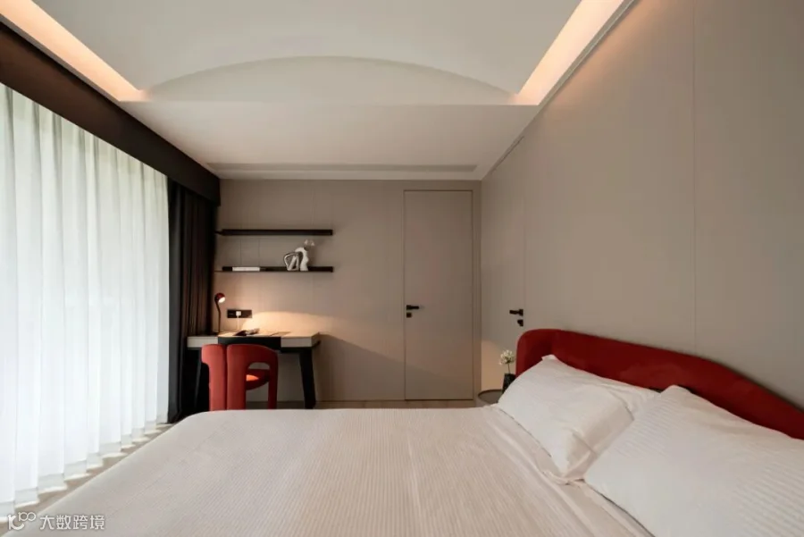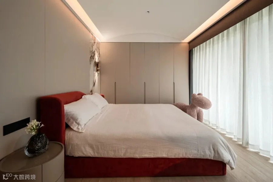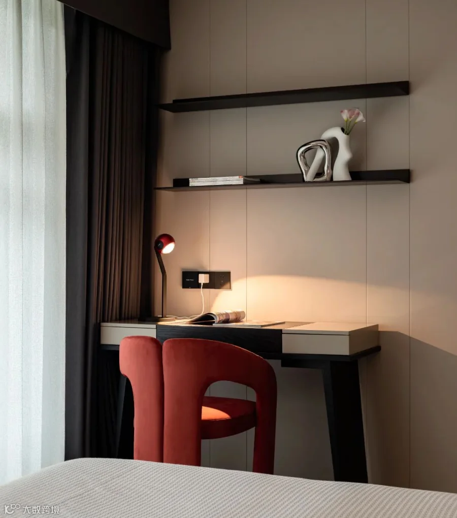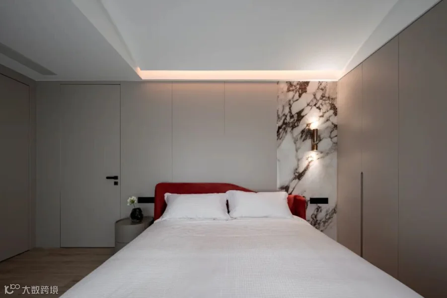 女儿房偏好以简约线条和素雅色彩勾勒出的高级感,这一抹亮丽的红色点缀更是点睛之笔,配上一片大理石背景墙, 瞬间提升了空间质感。