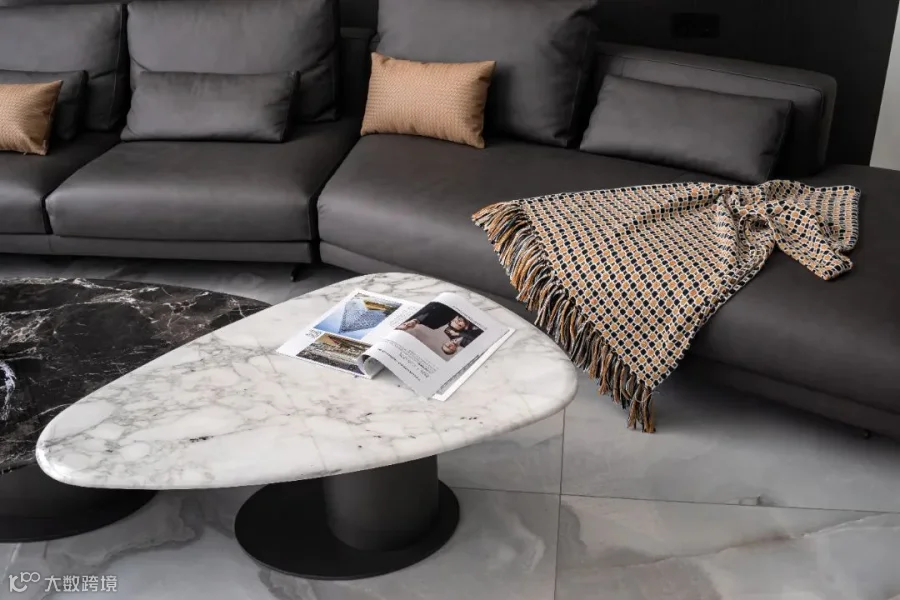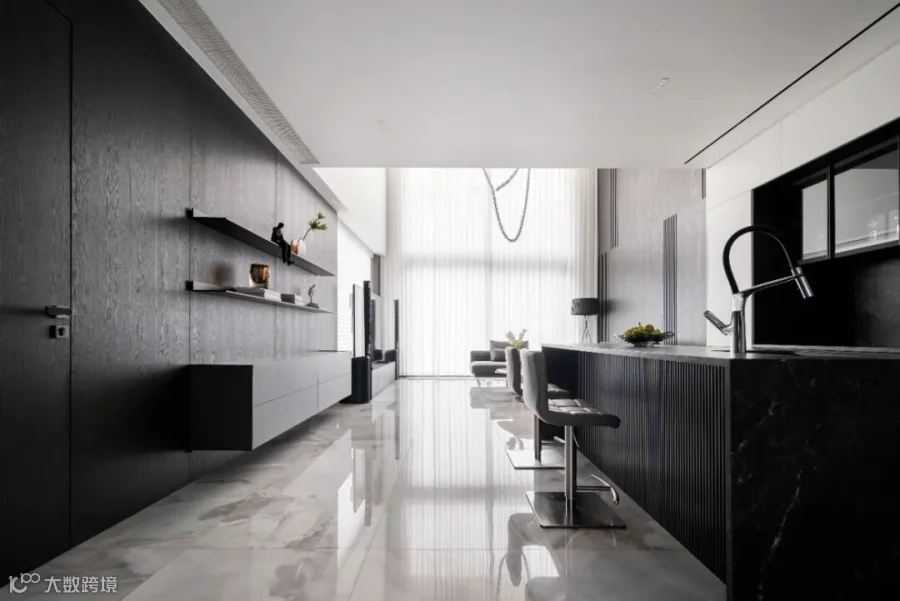 从客厅延伸至吧台,地面均以FLORIM汉妮玉2.0(海蓝)铺贴,让空间更具延续性,在光线的照射下,显露出温润且通透的玉石纹理,呈现出高品质的生活态度。