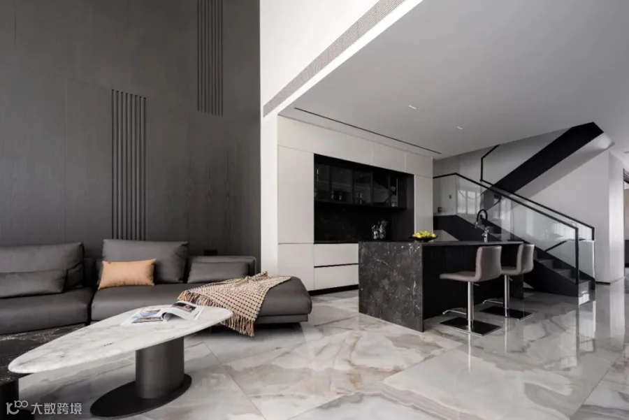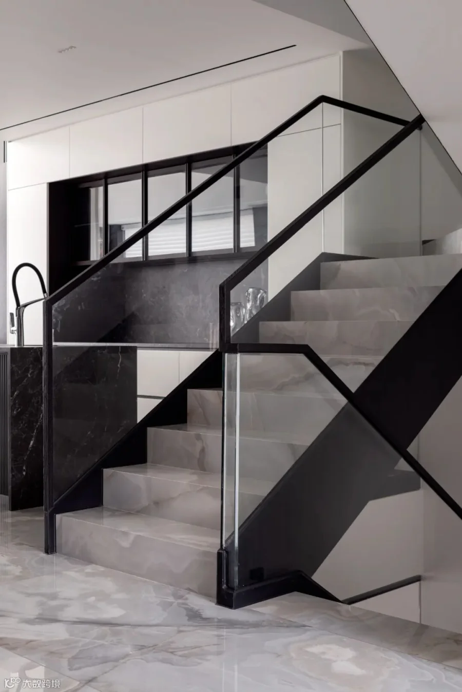 连接一层与负一层的楼梯设计也极具时尚感,选用FLORIM奢华设计的汉妮玉2.0(海蓝)和奢石(卡拉瓦乔)搭配,黑白配色简洁又不失质感,纯净玉石与黑棕奢石纹理的碰撞尽显奢华雅致之美。
