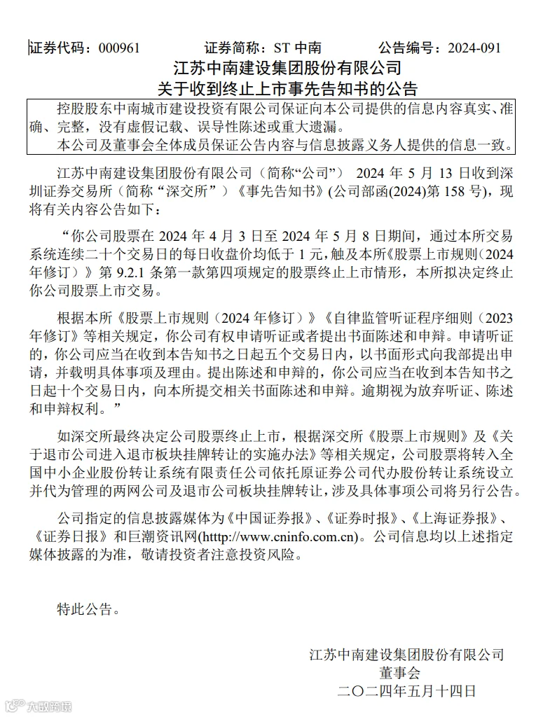 5月14日,江苏中南建设集团股份有限公司发布公告,宣布收到深圳证券交易所发出的终止上市事先告知书。