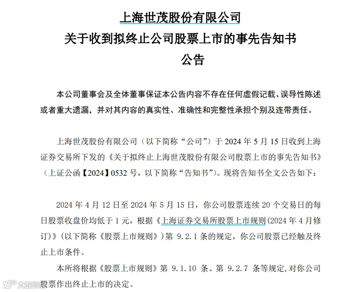 根据公告,*ST世茂于5月15日收到上交所下发的《关于拟终止上海世茂股份有限公司股票上市的事先告知书》。