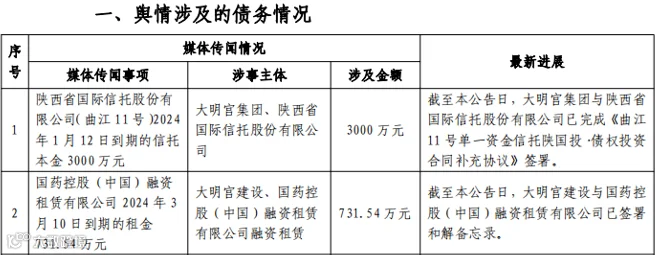 据悉,大明宫集团在陕西国际信托发行的“曲江11号单一资金信托陕国投债权投资计划”,也还有3000万元到期本金需兑付(截止2024年1月12日);大明宫建设与国控租赁仍有731.54万元到期租金未兑付(截止2024年3月10日)。