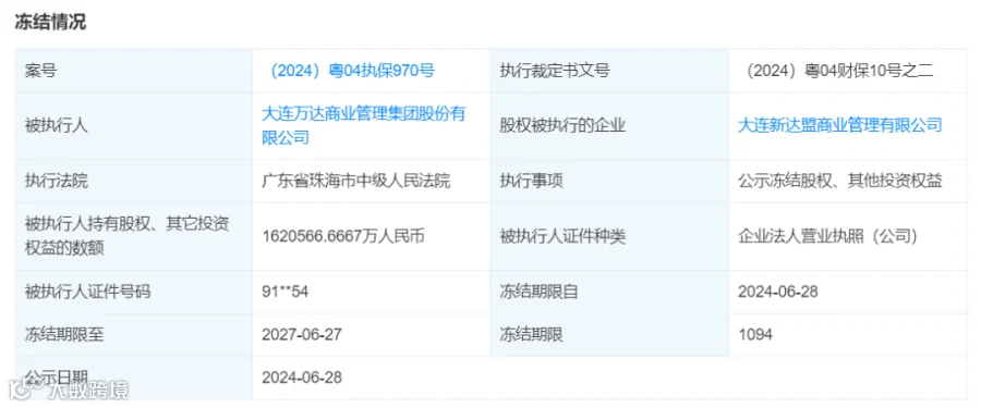 本次冻结情况显示:根据(2024)粤财保10号执行裁定文书,被执行人是万达商管,执行的标的是162亿人民币,执行对象是大连新达盟。