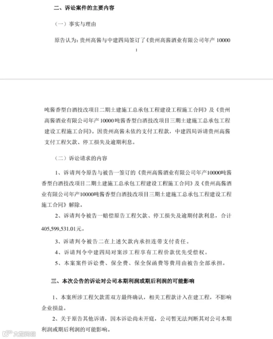 中建四局诉请解除上述合同,诉请贵州高酱赔偿405,599,531.01元,诉请上海贵酒在上述欠款内承担连带支付责任等。