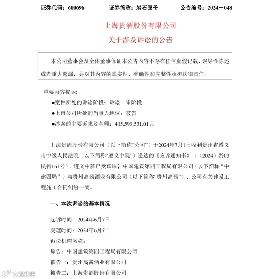 7月2日,上海贵酒股份有限公司(下称:上海贵酒)发布关于涉及诉讼的公告。公告显示,上海贵酒于近日收到遵义中院送达的应诉通知书,已受理原告中建四局与贵州高酱、上海贵酒有关建设工程施工合同纠纷一案。