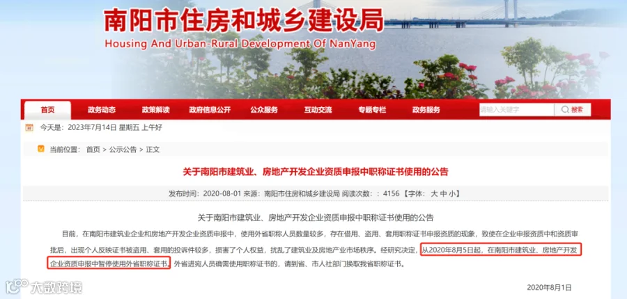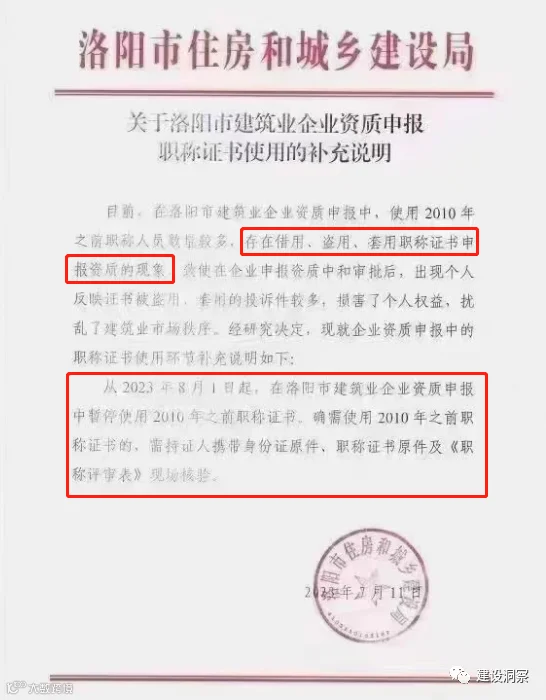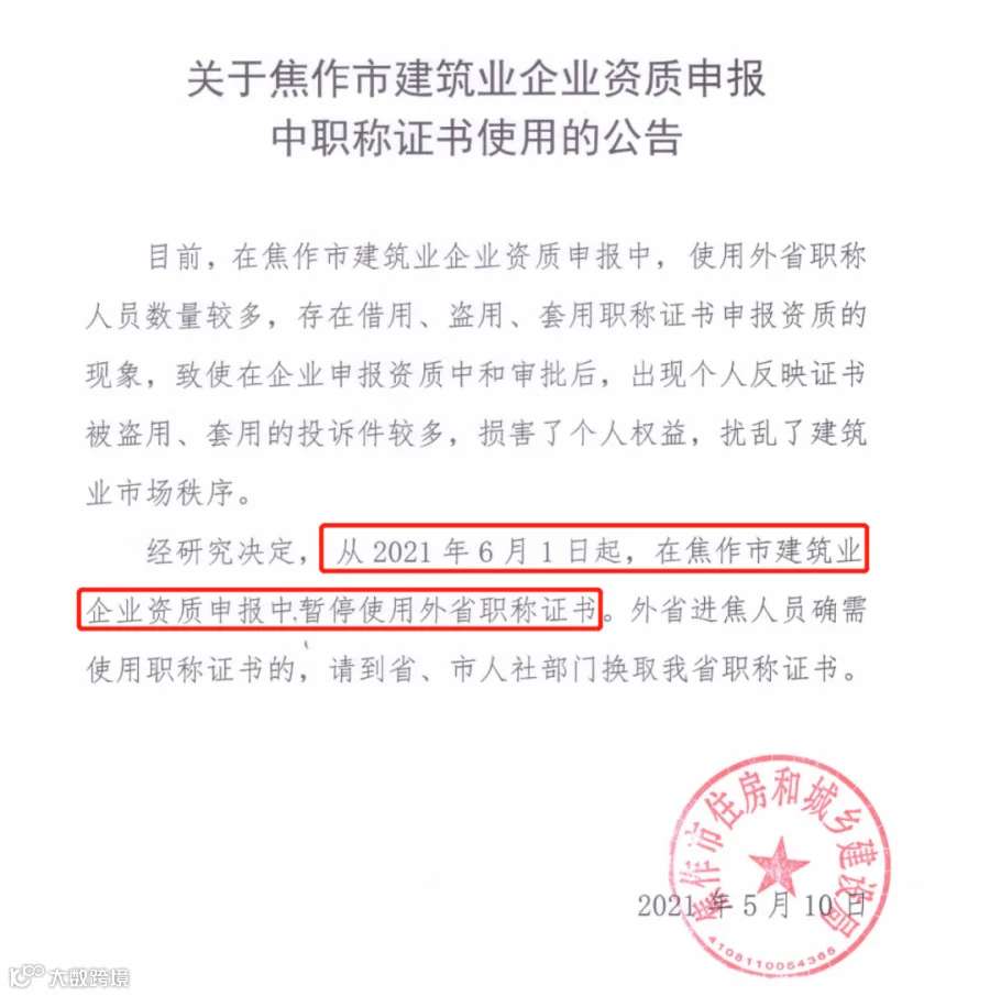 为进一步保护个人权益,规范建筑业市场秩序,更好的服务建筑业高质量发展。经研究决定,从2023年9月1日起,在鹤壁市(县、区)建筑业企业资质首次申报中暂停使用外省职称证书;从2023年10月1日起,在建筑业企业资质增项、升级申报中暂停使用外省职称证书。外省进鹤人员确需使用职称证书的,请按照《职称评审管理暂行规定》(人社部令第40号)等文件精神,到省、市人社部门换取我省职称证书后使用。
