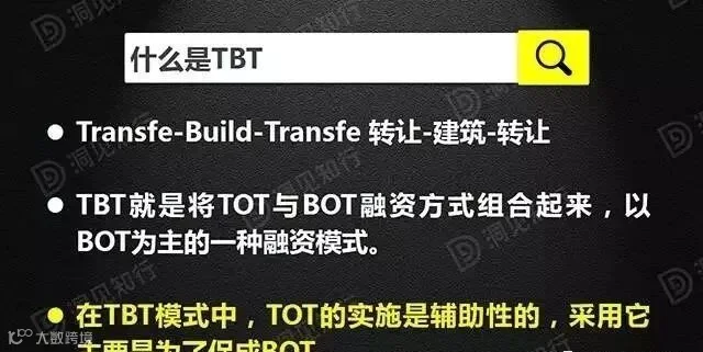 TBT融资模式中,政府通过TOT一次性融得资金后,会在BOT项目中入股,甚至主导项目的实施。这样,其他投资人就不用担心财务上和政府履行合同上的问题,而且有了政府的强力参与,又有了资金的保证,就大大增加了项目实施的成功率。
