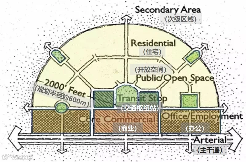 TOD开发的模式要求以火车站、机场、地铁、轻轨等轨道交通及巴士干线的站点为中心,以400-800米为半径建立中心广场或城市中心,这个城市中心最大的特点是集工作、商业、文化、教育、居住等为一身,使居民和雇员在不排斥小汽车的同时,能方便地选用公交、自行车、步行等多种出行方式。