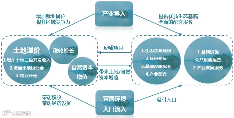 总结来说,EOD项目操作模式就是通过生态网络建设、环境修复、基础设施配套以及产业配套建设促使该区域及周边的土地升值,并为产业引入和人口流入提供良好的生态基底;一方面以产业发展增加居民收入、企业的利润和政府的税收;另一方面依靠人口流入带来政府税收的增加及区域经济的发展。最终实现生态建设、经济发展、社会生活三者协调发展。