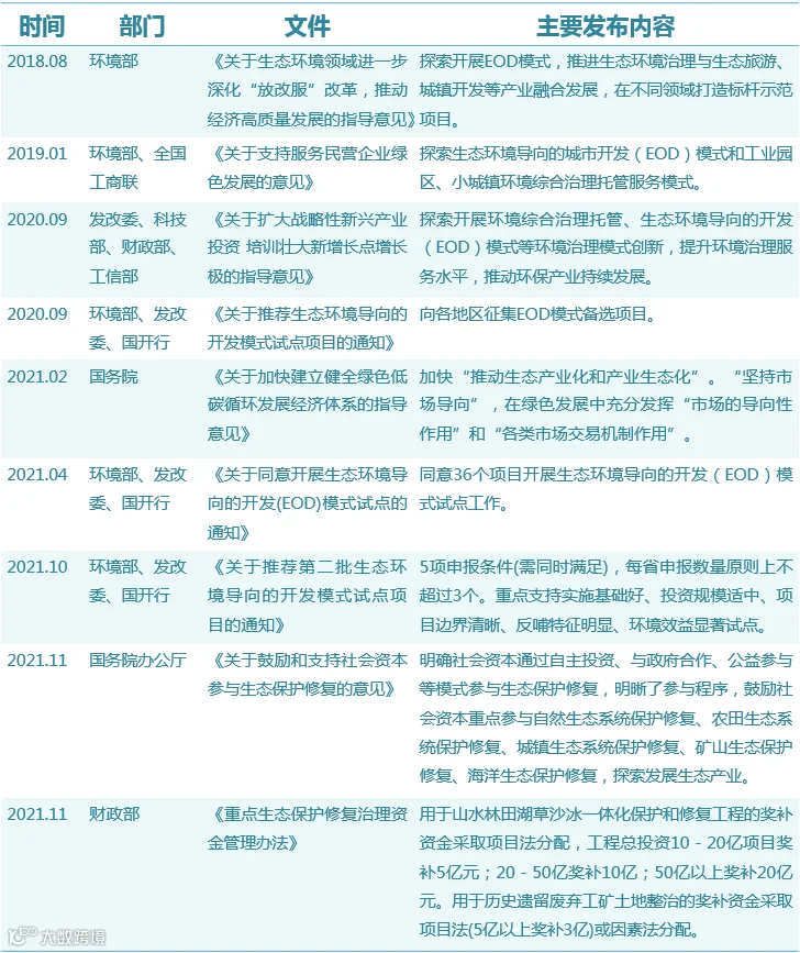 于是,基于项目实践的EOD模式应运而生。环境部从2018年即开始提出了EOD模式的倡议,时至今年,多部委陆续出台EOD相关政策,中央重视程度逐增。