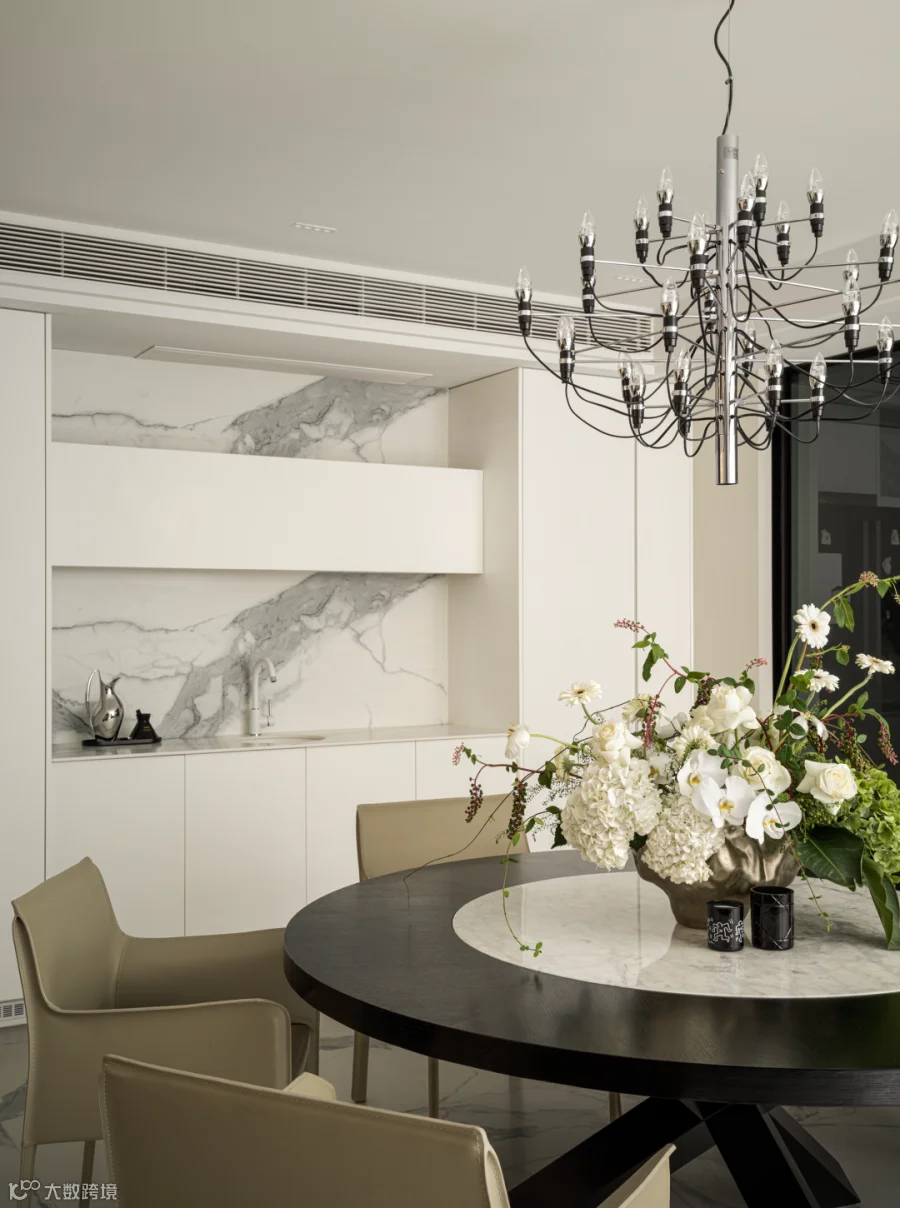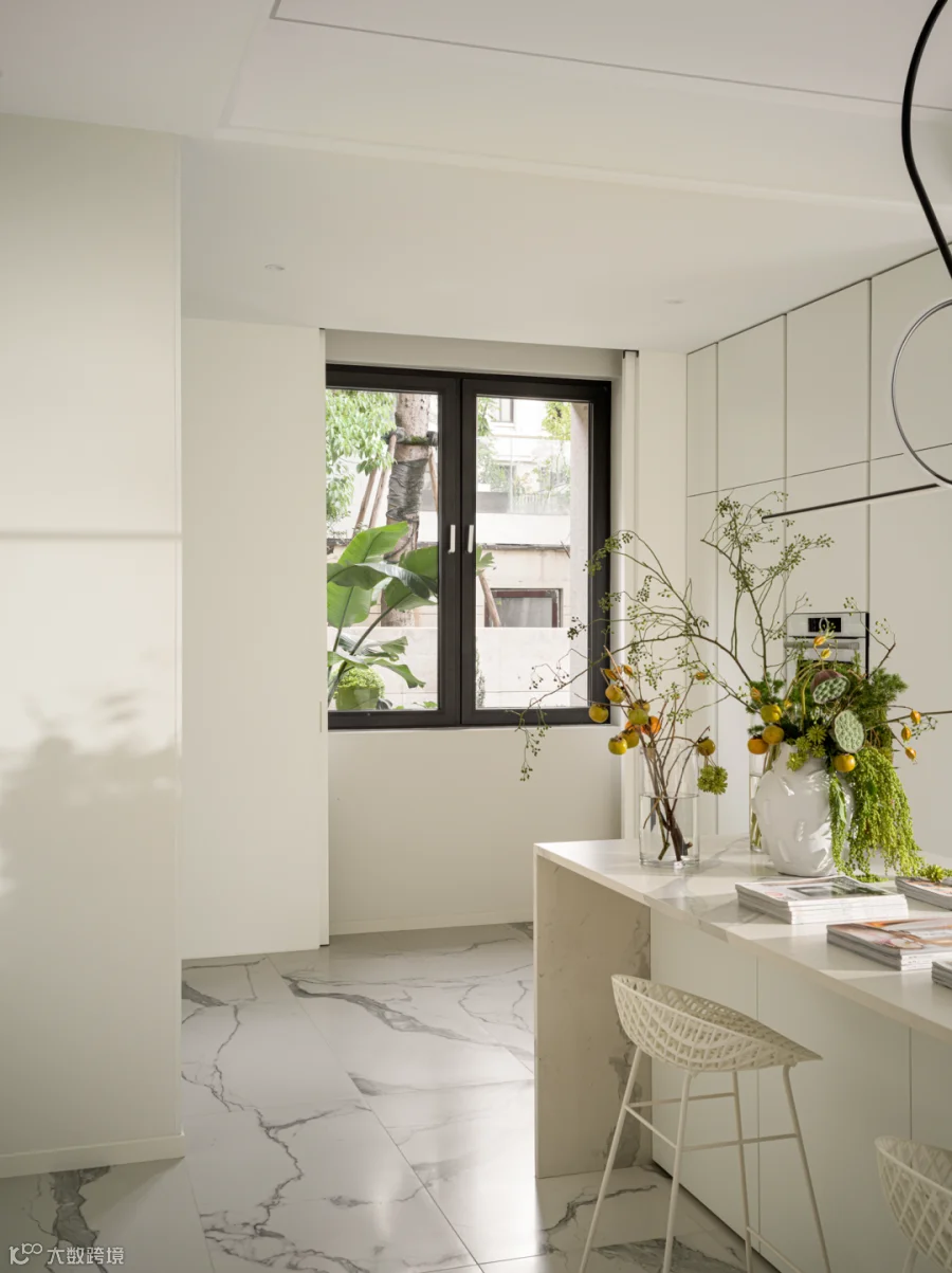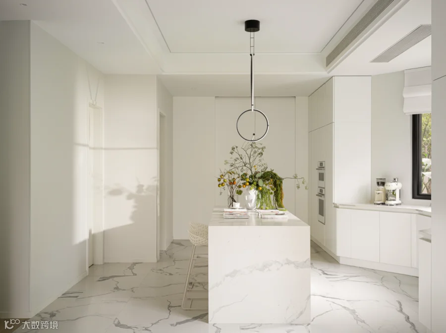 西厨空间一览无余的白色更显高级质感,当纯净高雅的意大利rex特级雪花白与极简异形的吊灯相碰撞,给素净的空间增添不一样的个性。左侧的窗户用同色系的电动门遮挡,拉上即回应了风水的最佳格局,拉开便与自然和阳光无缝连接,尽享宜人的美好时光。