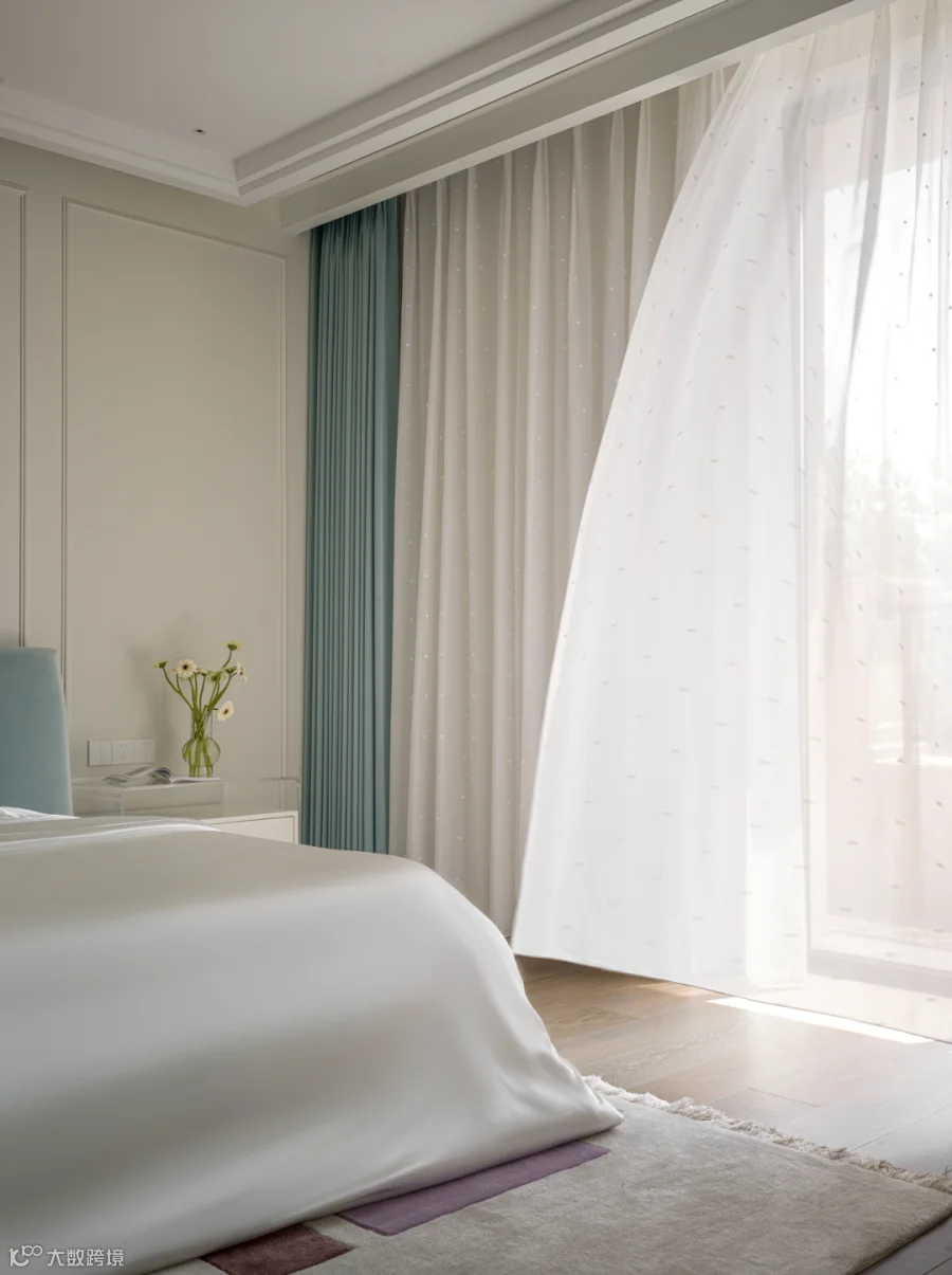 女儿的房间以浅蓝装饰,点缀在床头、窗帘,配合丝缎般的床品与鲜花,凸显女孩子的小优雅,碰撞出专属的私语空间。