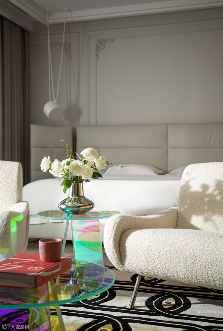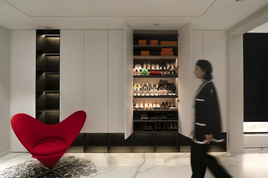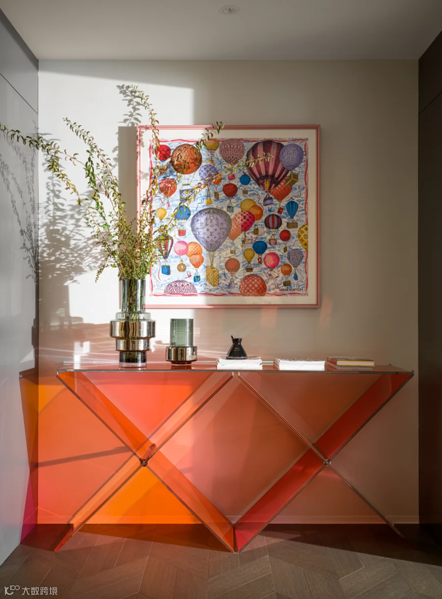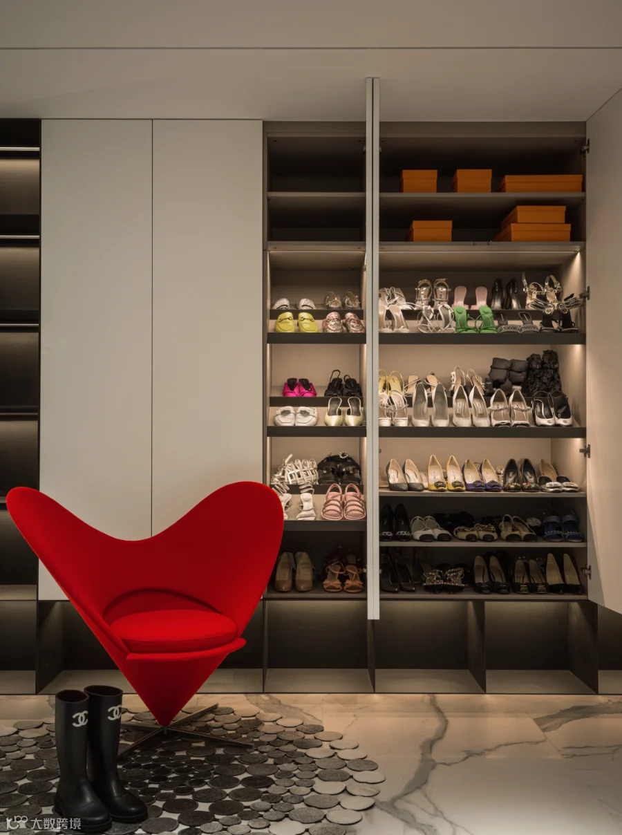 在门厅位置,我们则为女主人贴心打造时尚奢雅的收纳区域,盛放她的收藏与心头所好。醒目的Heart cone chair爱心甜筒椅,个性的墙面装饰与地面纯粹简雅rex特级雪花白相呼应,配合柔美的装饰灯光,未见其人便能感知女主人的精致魅力。