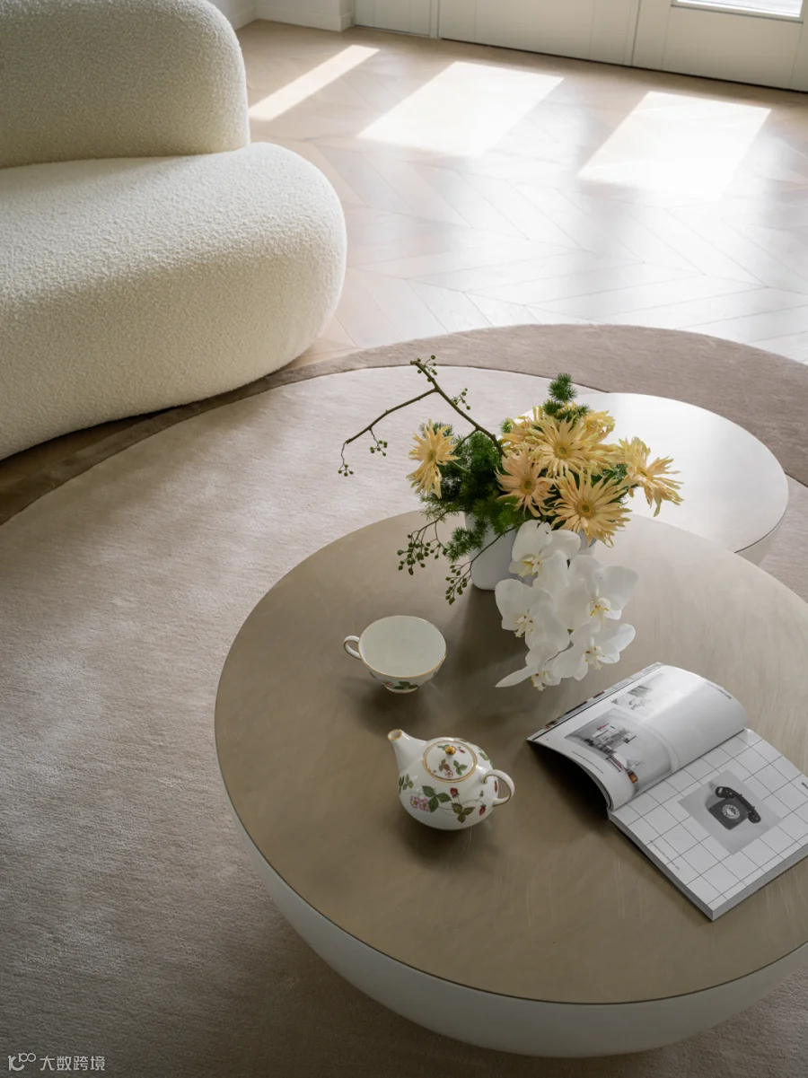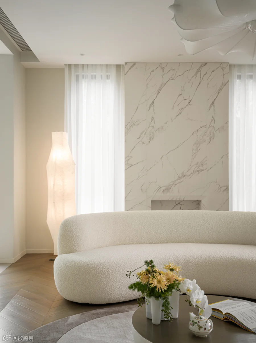 在休闲厅内,柔软和可爱占主导地位,PIERRE AUGUSTIN ROSE沙发一气呵成的弧度,充斥着满满的法式高级和优雅,配合FLOS蚕丝灯,更显鬼马俏皮。而那一面静谧的白色电动门,隐藏了电视区域,每一个精雕细琢的小巧思都从这里展开。