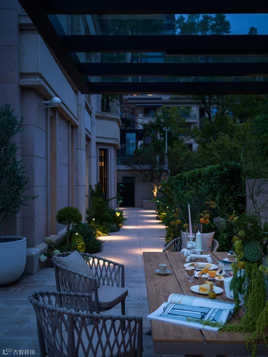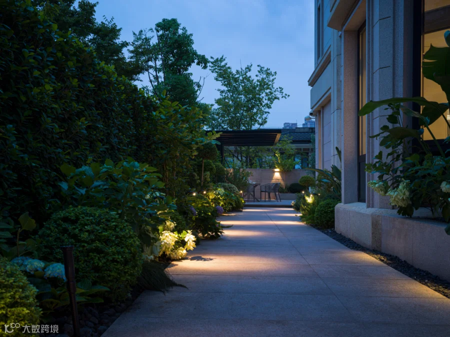 夜幕降临,盈盈灯光照亮花园,庭院在灯光的映照下,展现出与白日不一样的宁静之美。