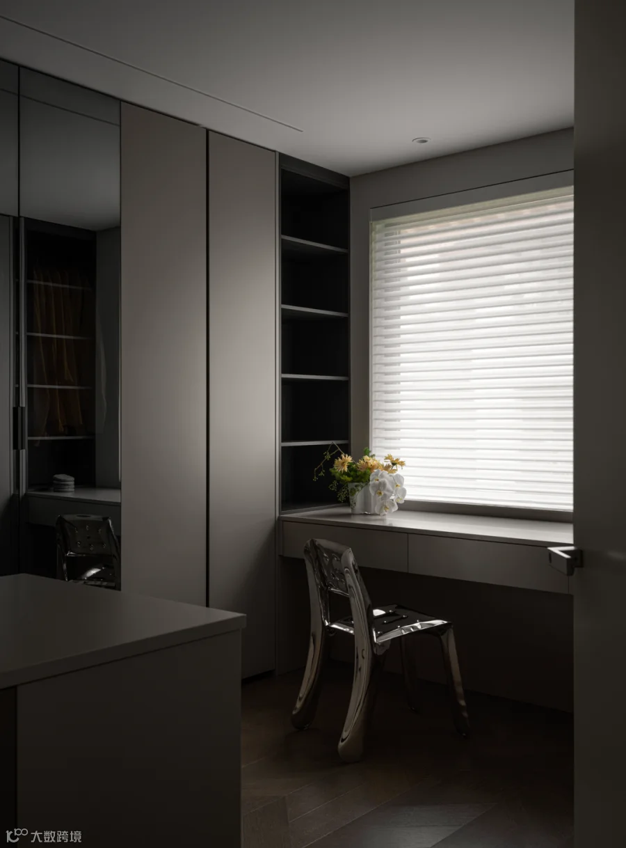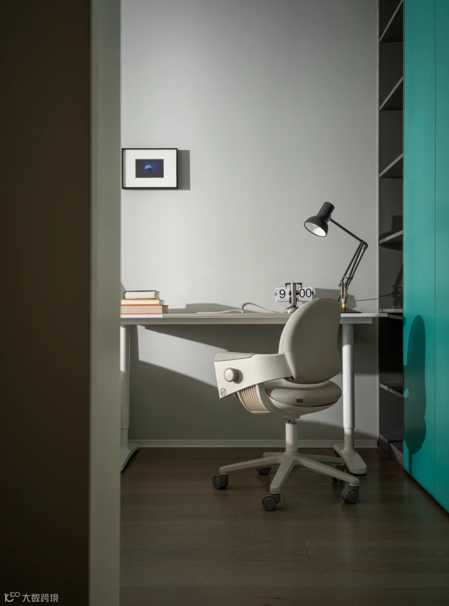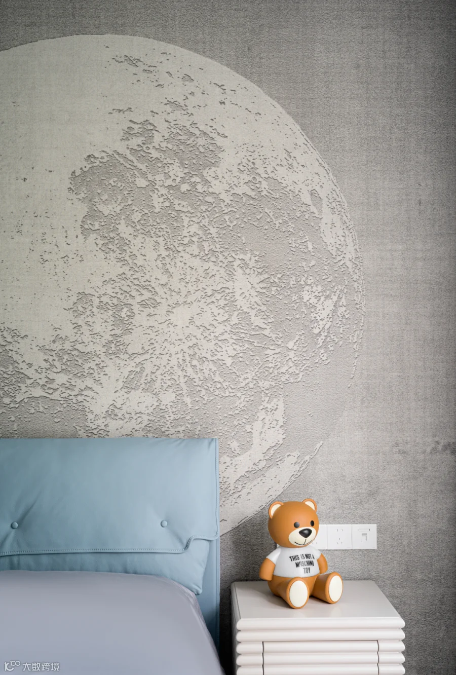 小儿子房间的墙面则运用了若隐若现的月球纹理,个性的收纳柜更添时尚精致,光影重叠下,弥漫着安宁、自然、童真的浪漫氛围。