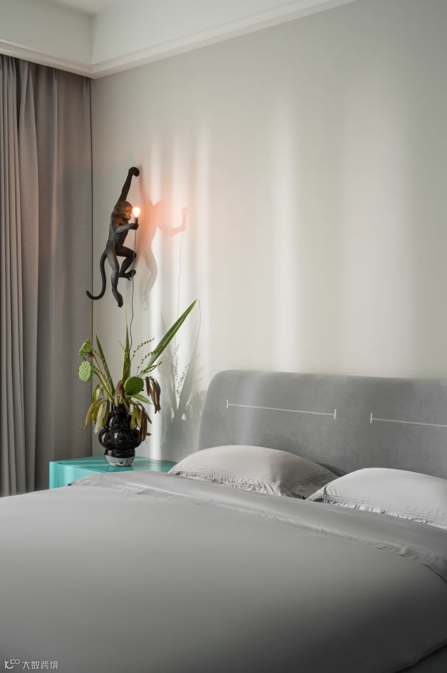 大儿子房间的灰色墙面与绿色衣柜形成鲜明对比,SELETTI猴子灯则让沉静的氛围中多了些许跳跃,为空间增添了几分趣味。