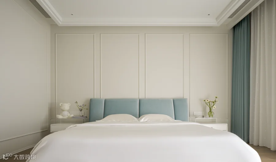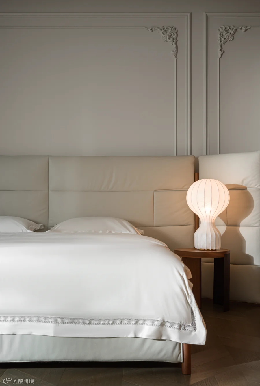 在主卧空间内,轻盈与沉稳的联结是居者气质的体现,更是浪漫和复古在其中的温柔延展。