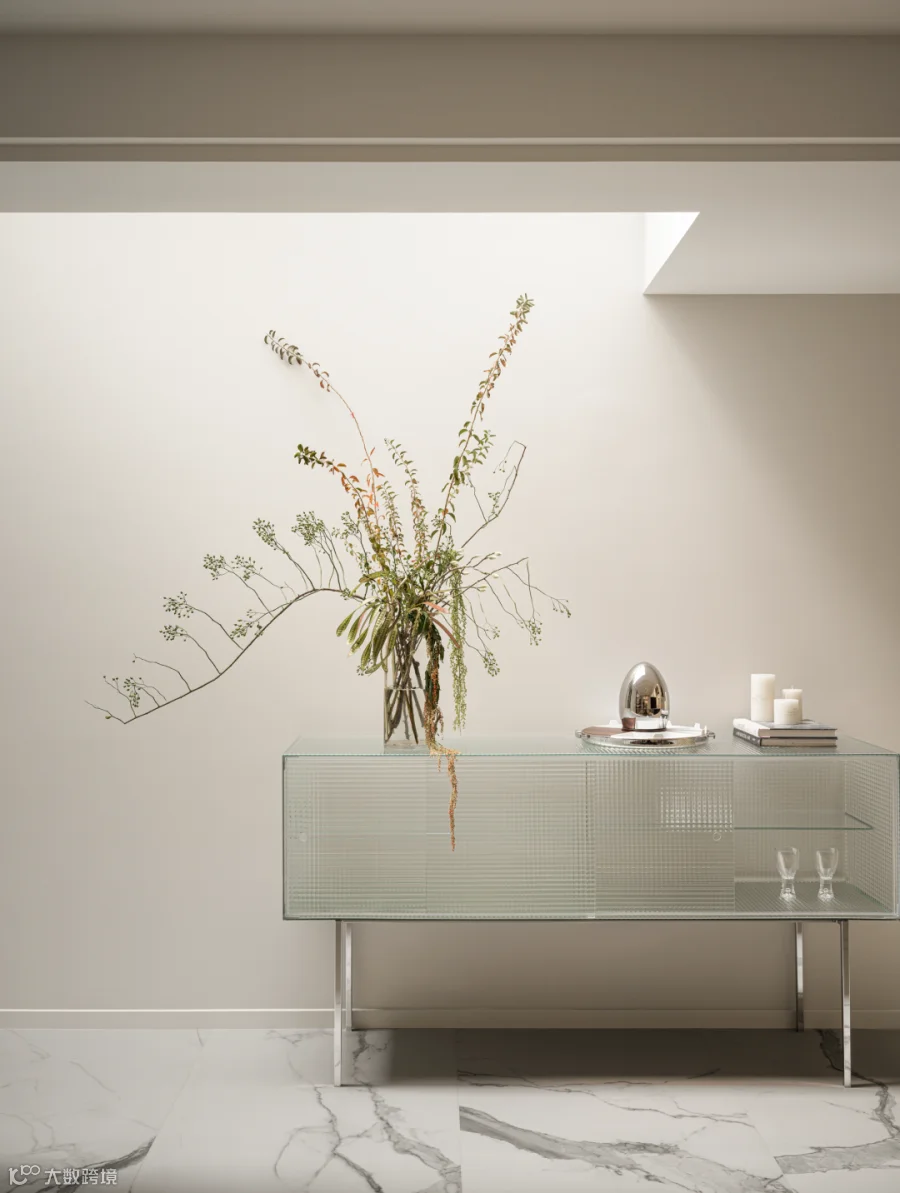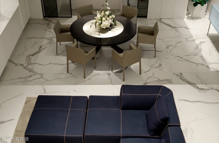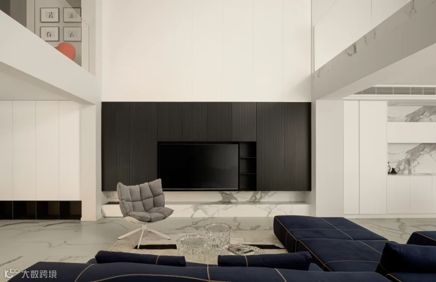 B&B Bend沙发一抹沉稳的蓝色让休闲区更添舒适和温暖的质感,混搭酷黑的电视背景墙、晶莹澄澈的玻璃装饰桌,奇妙的组合,让空间呈现有趣的视觉分隔和精英感的清新气质。意大利rex特级雪花白的地面,让高级感和清透感同时凝炼表面,细腻的纹路氤氲出优雅的艺术意境,创造出独特且个性的艺术风格。