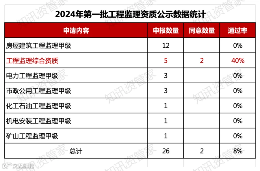 工程监理资质:申报资质26项,同意2项,公示通过率8%;