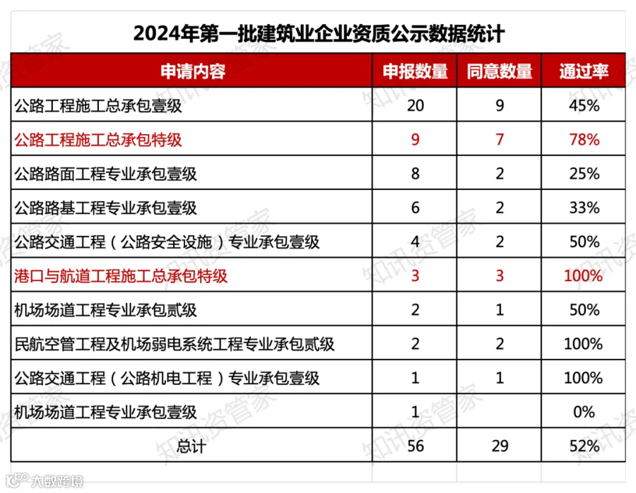 建筑业企业资质:申报资质56项,同意29项,公示通过率52%;