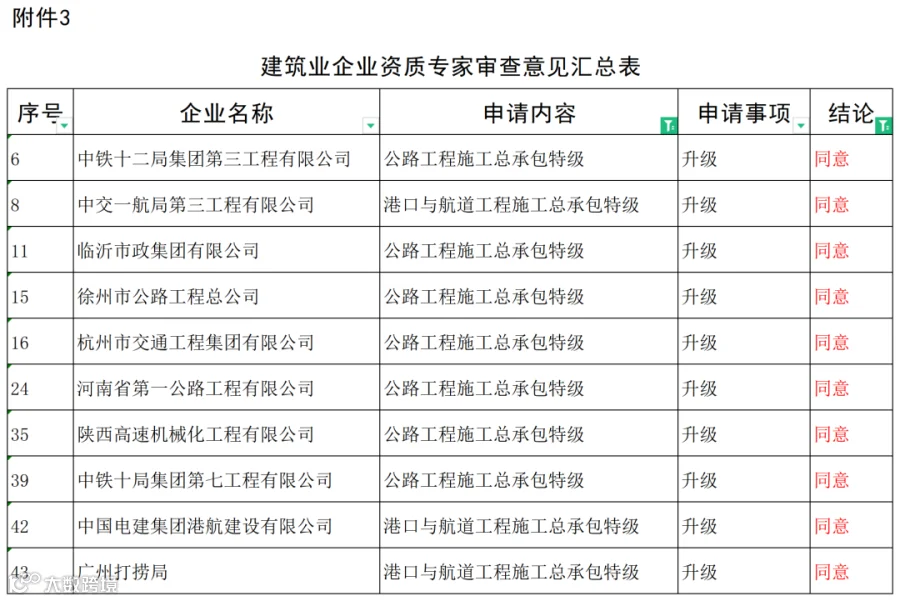 1月5日,住建部发布《关于建设工程企业资质专家审查意见的公示》。其中同意10家建筑业企业升特。