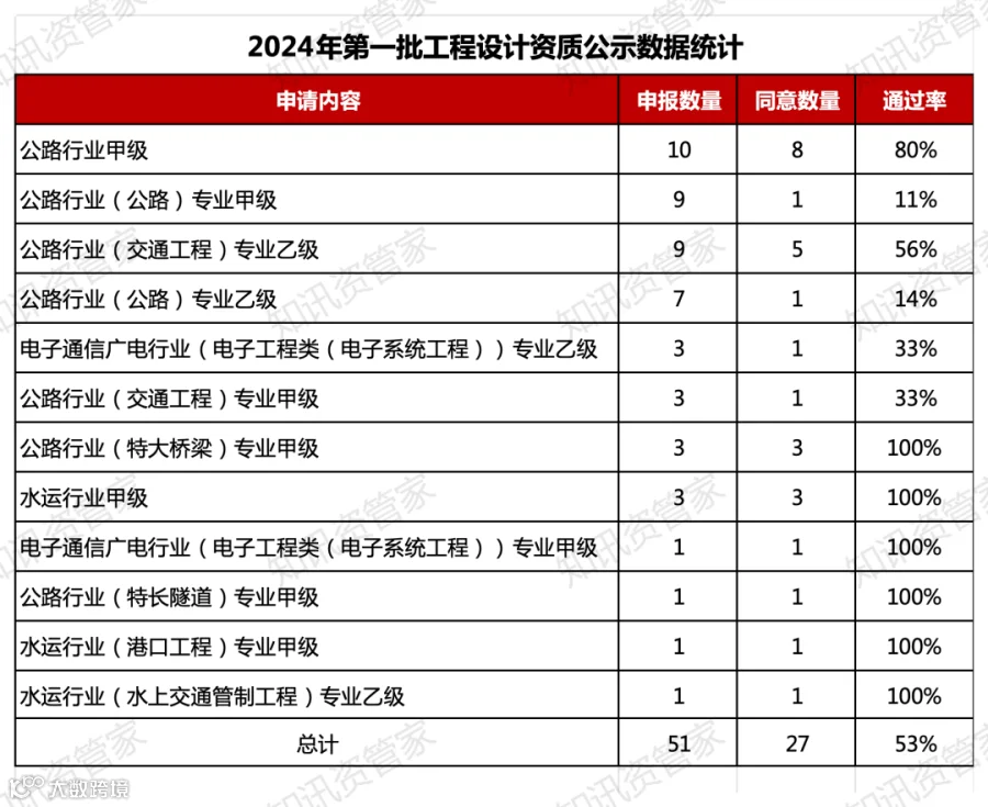 工程设计资质:申报资质51项,同意27项,公示通过率53%;