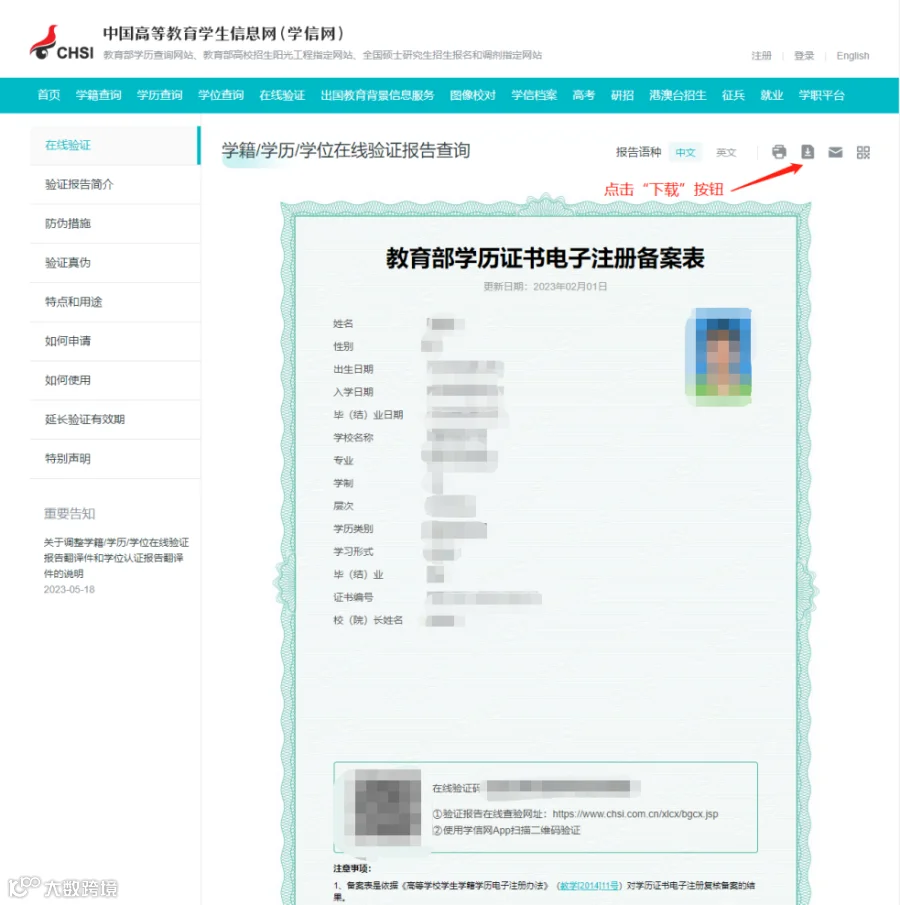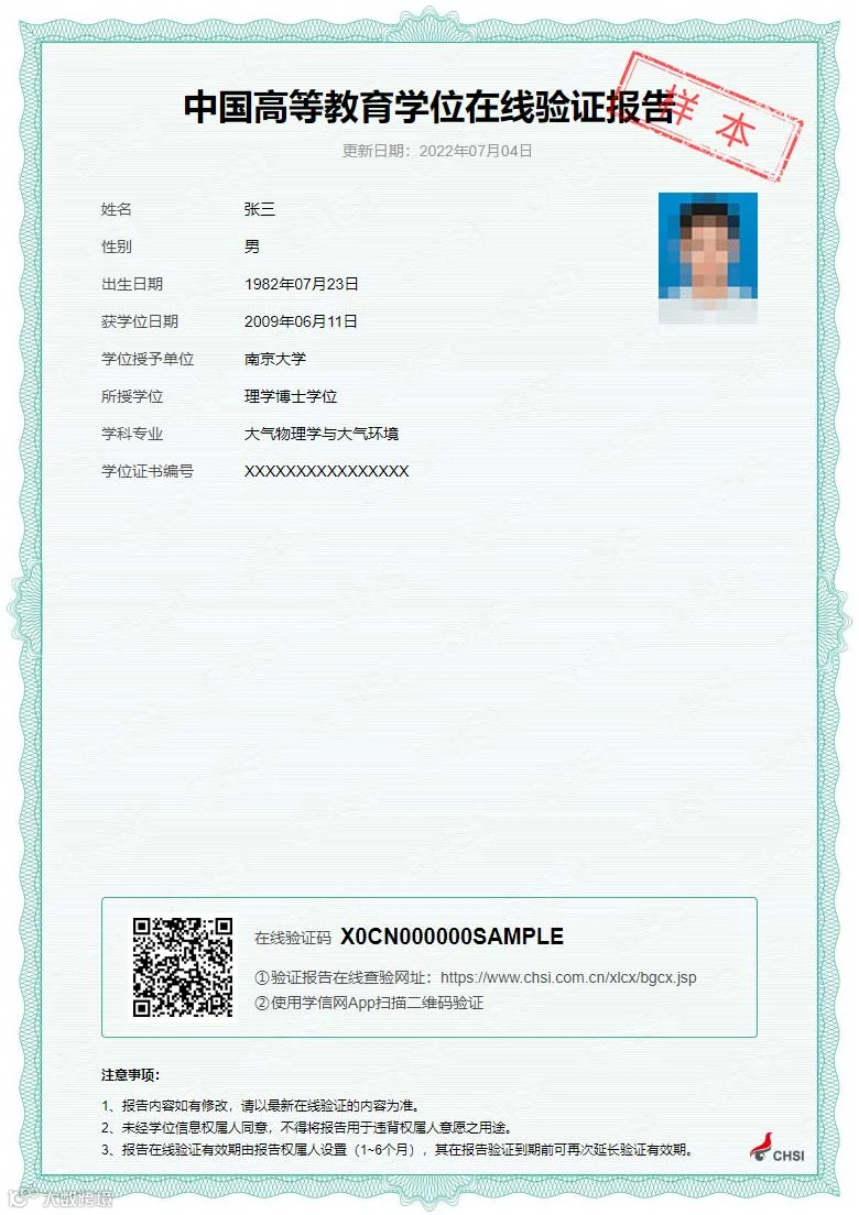 学历学位在线验证/认证报告示例