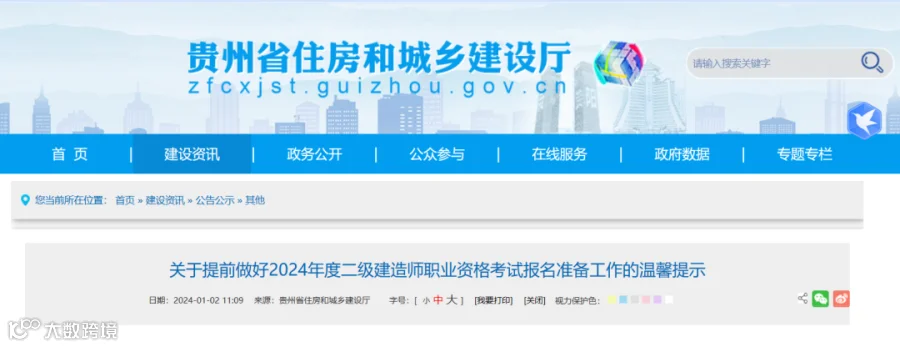 2024年1月2日,贵州省住建厅发布《关于提前做好2024年度二级建造师职业资格考试报名准备工作的温馨提示》,也发出提醒: