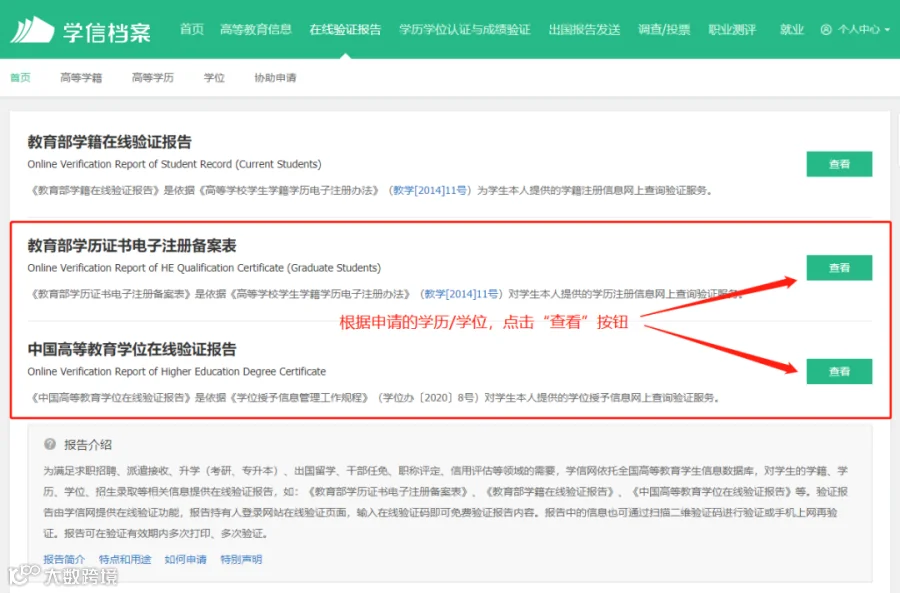 5.根据申请的学历/学位,点击“教育部学历证书电子注册备案表”或“中国高等教育学位在线验证报告”栏目的“查看”按钮。