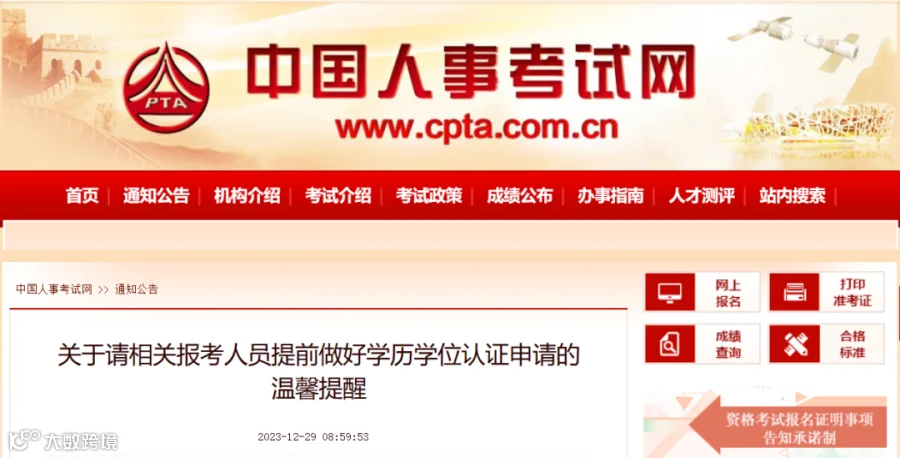 12月29日,中国人事考试网发布《关于请相关报考人员提前做好学历学位认证申请的温馨提醒》(文末附具体操作流程):