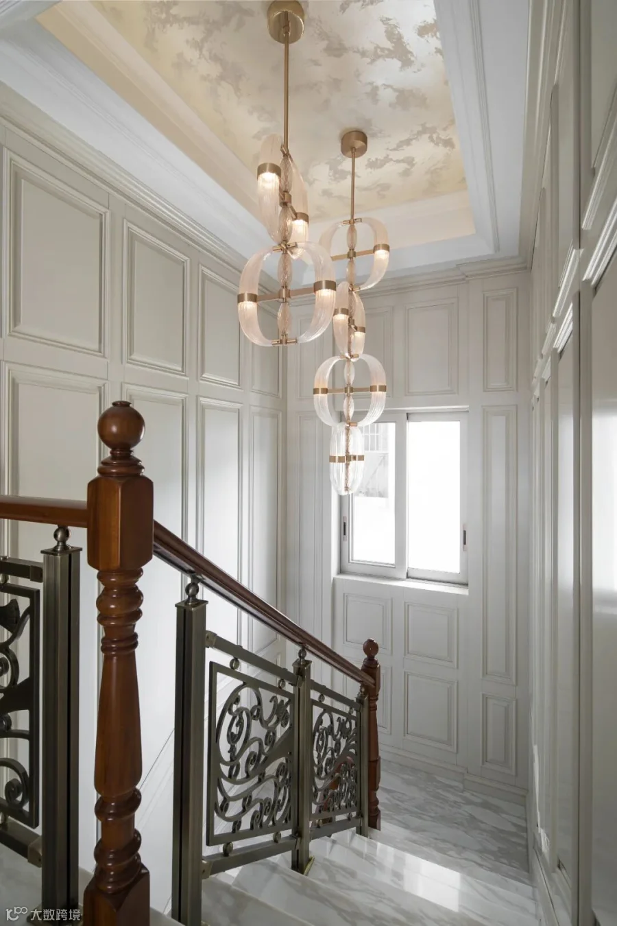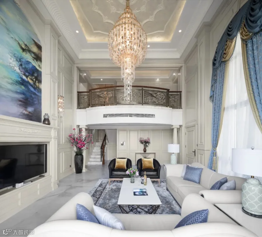 象牙白与高级灰糅合,蓝与白的经典碰撞,将历史的痕迹与浑厚的文化底蕴,隐匿在现代的肌理中;像是一位款款的绅士,将风华内敛于心,外放于身,自有一番大家风骨。阳光透过重重叠叠的枝蔓,光影被分割投射在大理石地面;色调随即变得深浅不一,给人似疏影横斜,暗香浮动的空间美感。
