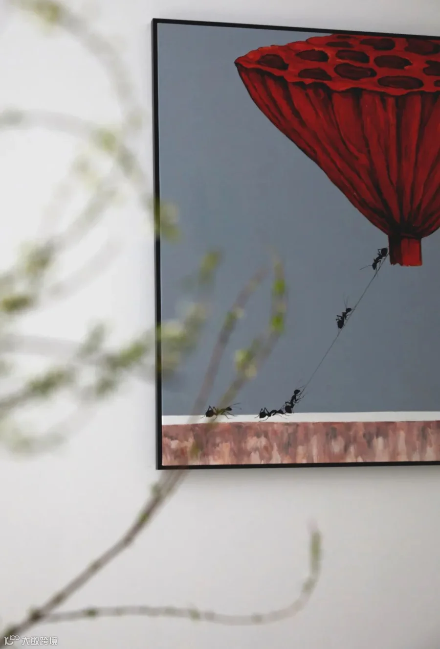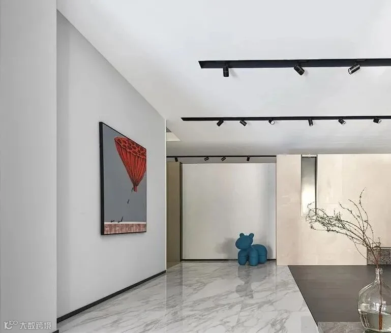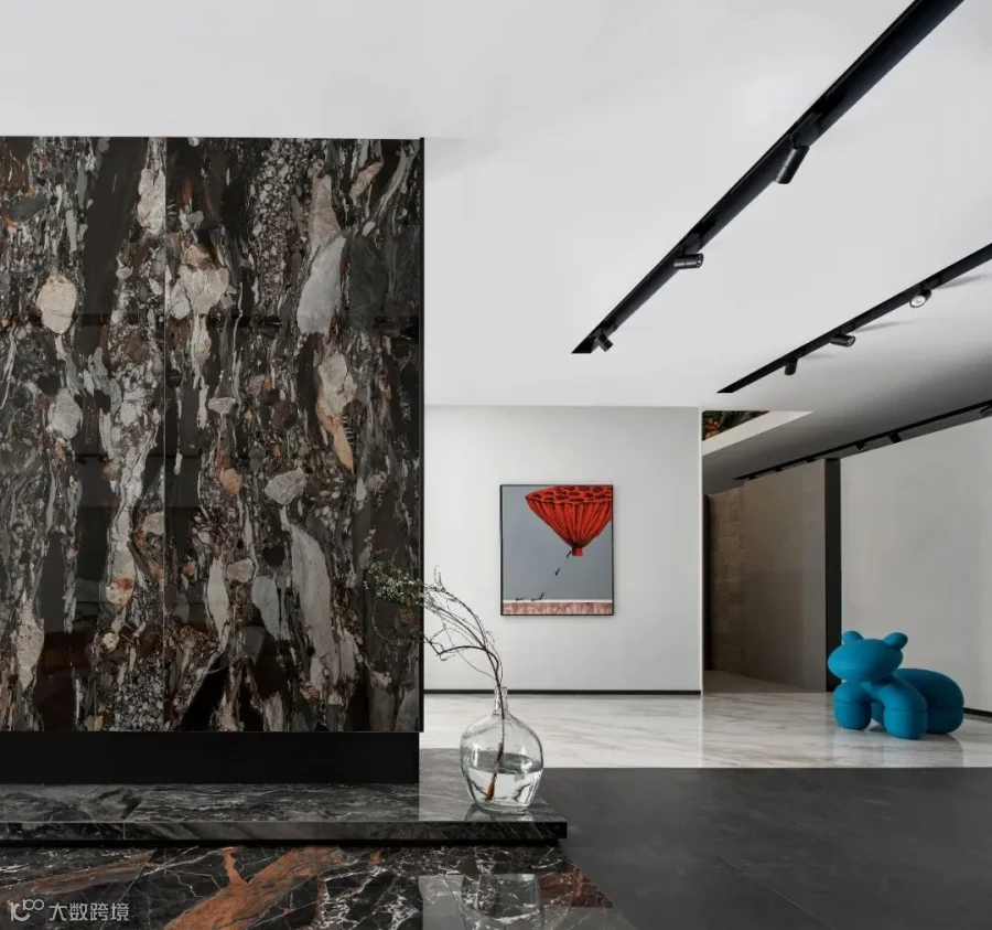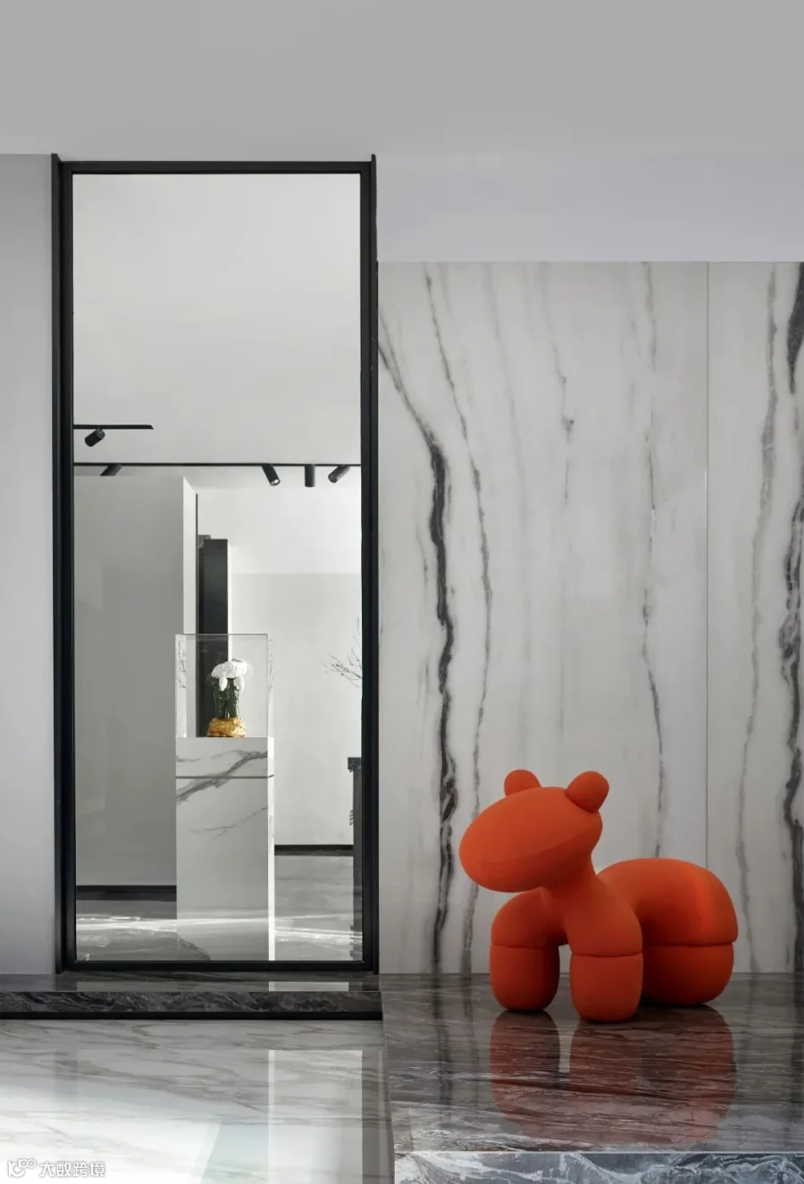 意大利REX锐思卡拉卡塔系列熊猫白肆意泼洒的水墨与红色玩偶强烈碰撞,打破空间单一空旷的格局,虚实结合的镜面结构,灵动与沉寂,与空间对话,创造融合共生的氛围。