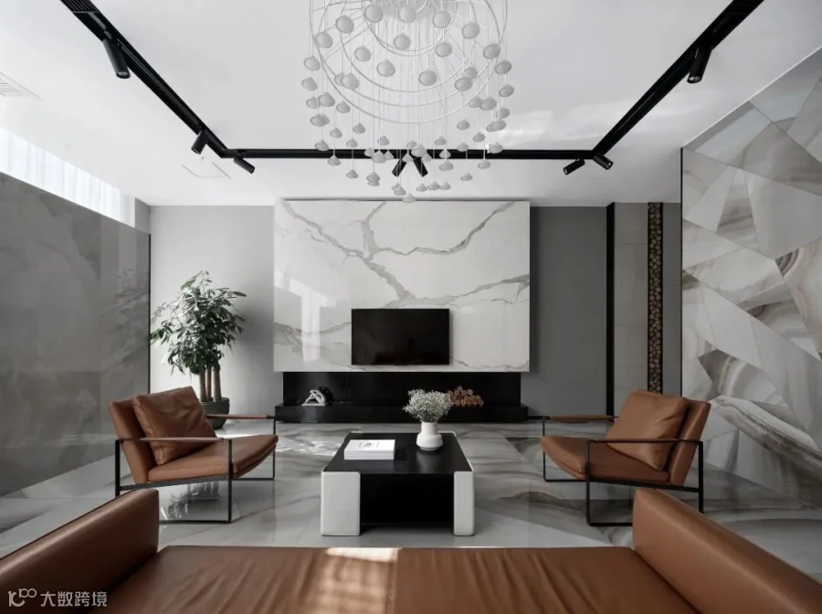 会客厅以场景化创造和现代化演绎,回归到对生活本质与人居美学的思考,以一种简约优雅的设计语言,将其解构融入空间中,临近色彩的调配加以色温的改变传递视觉愉悦,结合精致优雅的意大利REX锐思卡拉卡塔系列特级雪花白背景墙,营造一个高端的私人会客的生活美学体验区。