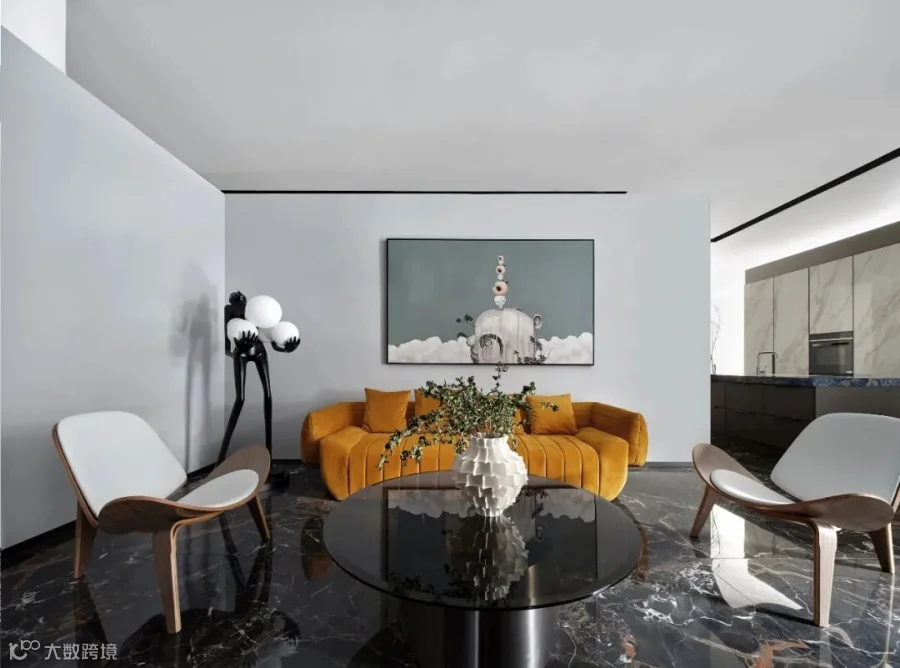 现代感十足的客厅基调,运用了Art deco艺术装饰风格,新颖的软装造型、艳丽夺目的色彩搭配,成神秘而不张扬的层次感与俏皮的复古黄色沙发形成了前卫的视觉结构,一抹清新蓝穿插其间,打造摩登艺术的视觉符号。